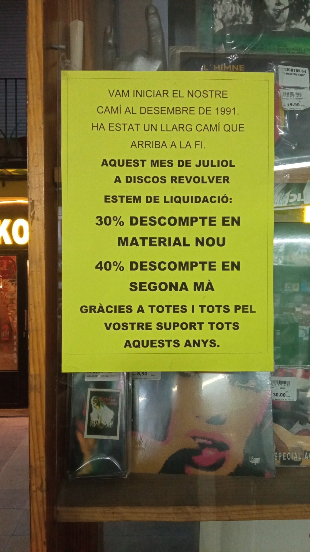 Difícil y dolorosa decisión después de 34 años tenemos que dar por concluido un proyecto que ha durado 34 años y con toda mi impotencia y dolor que causa éste cierre que por motivos de especulación inmobiliaria, aumentos considerables de precios en la industria discográfica y falta de ayudas institucionales nos vemos obligados a cerrar una parte de la historia de Discos Revolver