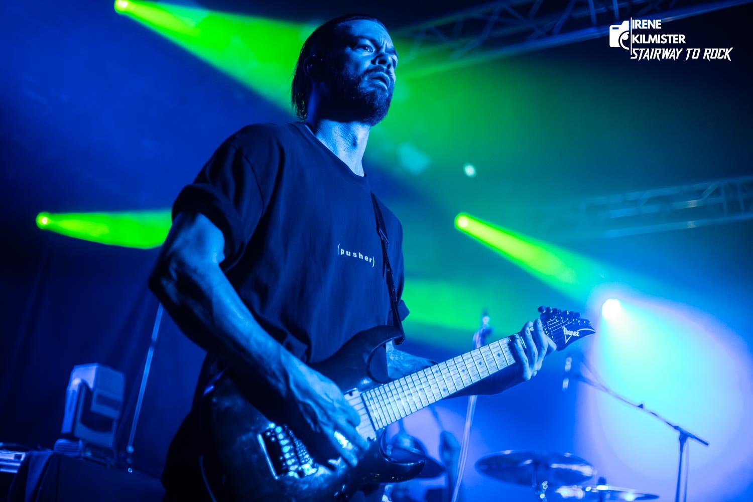 Si el concierto de Great American Ghost fue puro fuego, lo de After the Burial en Razzmatazz fue el descenso a un abismo hipnótico. La sala se sumergió en la penumbra casi total: apenas unos haces de luz azul y verde recortaban las siluetas de los músicos, creando una atmósfera que oscilaba entre lo etéreo y lo opresivo. Nada de artificios, nada de distracciones; solo sonido, sombras y un público completamente entregado.