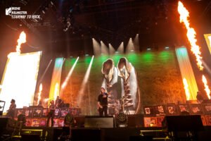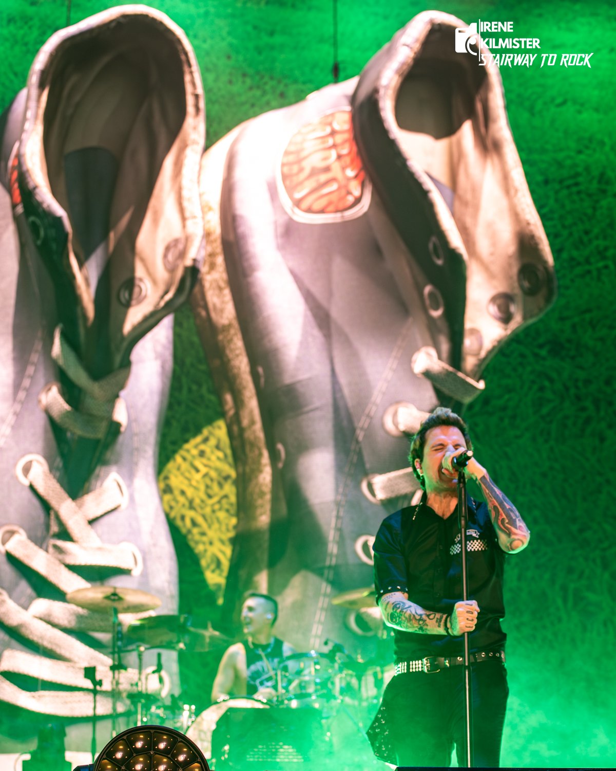 Todo esto iba acompañado por una puesta de escena donde los telones traseros se sucedían uno tras otro, cambiando acorde con los temas, las pantallas que mostraban a la banda se animaban con las letras de las canciones o efectos acordes a las mismas y el fuego calentaba a las primeras filas desde el escenario. Aunque claro, que el broche de oro lo ponían los hinchables de las zapatillas y la peineta que coronaron el escenario gran parte del show.