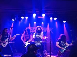 Siguieron su batalla personal con «Intruder», acerca de un guerrero que atraviesa un portal temporal, para salvar el metal a base de violencia, que fue seguida por un cover de «Black Demon» de Running Wild, así como de «Night of Evil», crítica a las guerras entre trincheras, en cuyos pegadizos coros Guillem apoyó a David. Este último tiene una presencia escénica innegable, además de una poderosa voz que va genial para su propuesta musical. Después vino «Morrigan», diosa celta que traiciona a una compañía de guerreros y les hace perder en la batalla, si bien estos la persiguen al más allá y le cortan la cabeza. Pusieron el punto final con otra adaptación que encantó a los aficionados del metal más de nicho: «Necropolis», de los legendarios Manilla Road, que nos encantó a mí y a varios que lo dimos todo entre las primeras filas. A pesar de llevar pocos conciertos a sus espaldas, se nota que ya se van compenetrando sobre el escenario, ya que ofrecieron una actuación genial para empezar la noche. ¡Con muchas ganas de volver a verlos el próximo 7 de marzo, en el Screamin’ Assault de la Sala Upload, junto a los igualmente épicos War Dogs y Meurtrières!