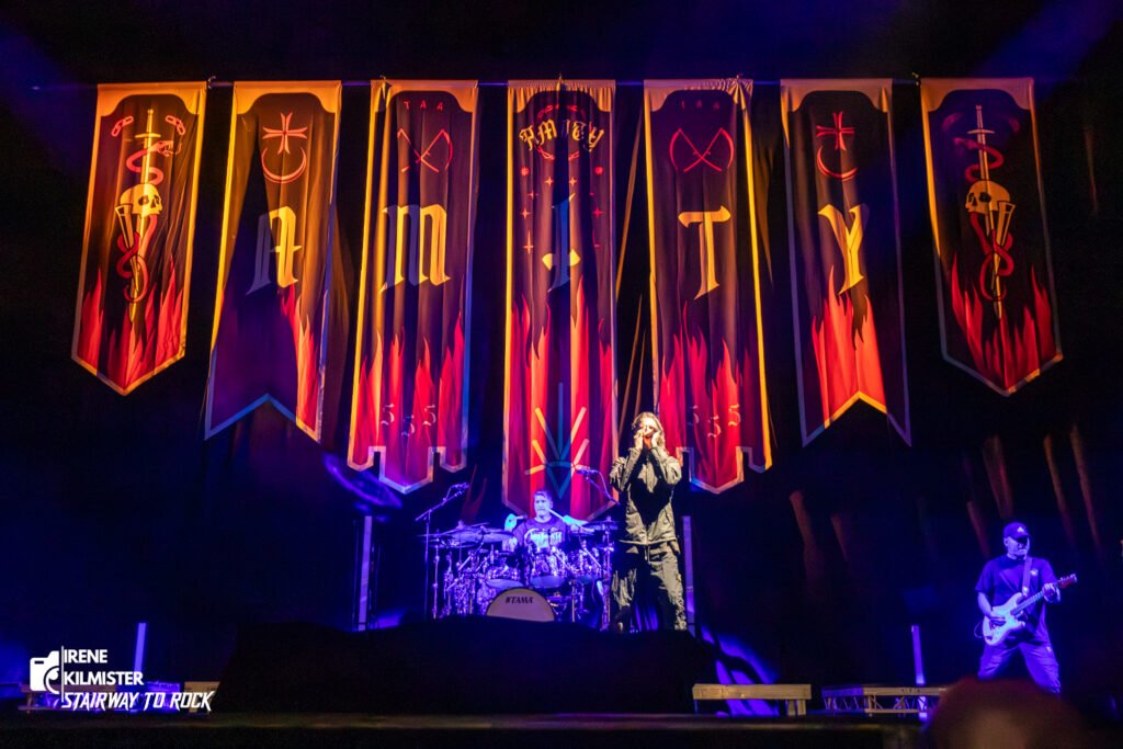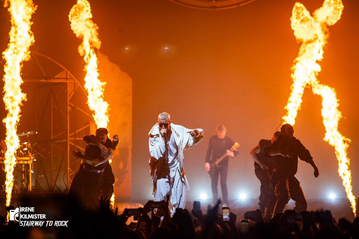 Fue con “Glitch” que la banda dejó caer el backdrop de sus espaldas para revelar su impresionante puesta en escena, así como una cuadrilla de ninjas bailarines y las primeras llamaradas de la noche, que se hicieron especialmente presentes en “Sacred”, convirtiendo el escenario en el órgano excretor del que cena veinte alitas picantes.