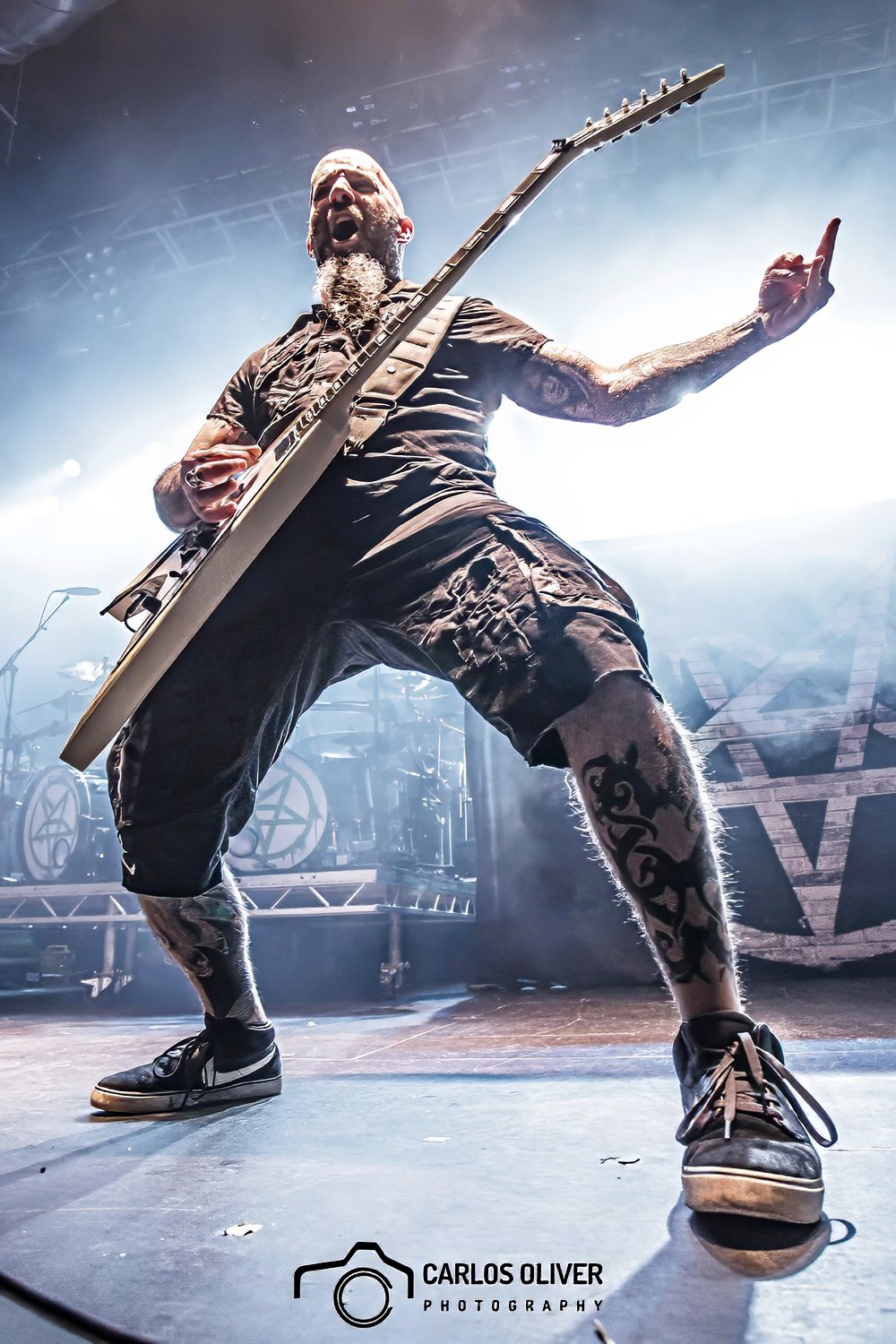 Una de las grandes satisfacciones que me ha dado la fotografía de conciertos es poder retratar en varias ocasiones a algunas de mis bandas preferidas, como es el caso de Anthrax. A veces es inevitable llevarte por las emociones. Esta instantánea, en concreto, se tomó en un concierto que fue realmente infernal, en su gira con Slayer, y con un Razzmatazz hasta los topes con un aforo que rozaba los límites de seguridad permitidos. Según me contaron, el mismo Scott Ian, antes de salir del escenario, se interesó en saber dónde estaba la salida de emergencia. A la semana siguiente, ocurrieron los atentados de París con el asalto terrorista a la sala Bataclan.