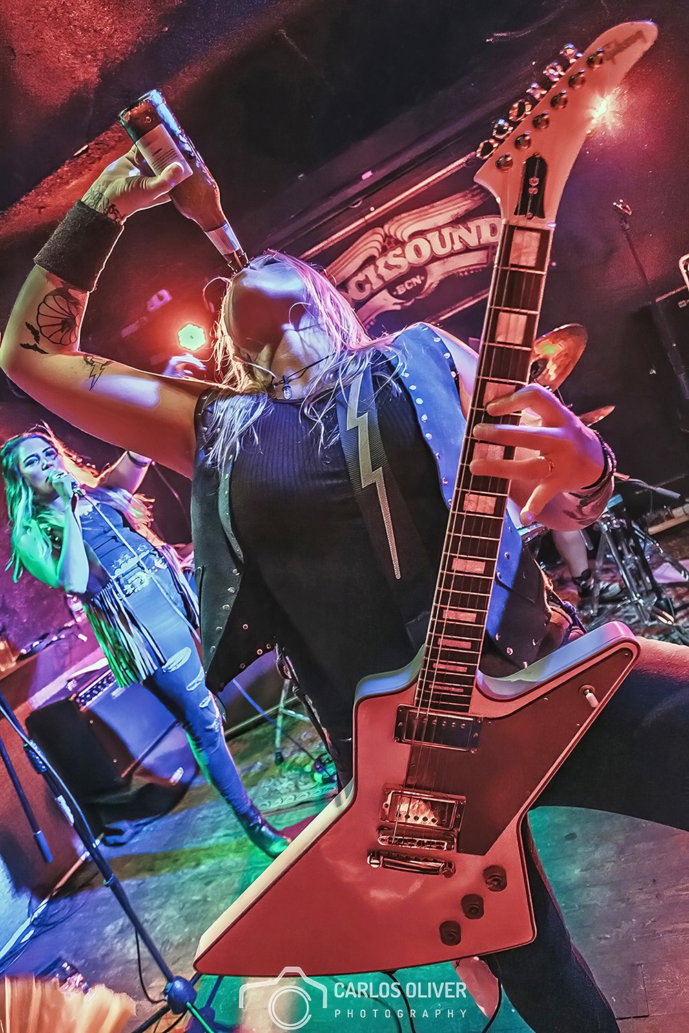 Esta foto me gusta por diversos factores. Fue tomada en la añorada Rocksound, que tan buenos momentos me dio… muchos conciertos, muchas cervezas y siempre junto a la mejor compañía. Sin duda, este fue un día más en los que el techo de nuestro querido pequeño templo literalmente sudaba. Me encanta hacer fotos en locales pequeños, notar esa cercanía de los músicos y del público. Esta foto creo que capta perfectamente la intensidad y la hermandad de lo que allí se vivía. Y por otro lado creo que ilustra la fuerza y la importancia del papel de las mujeres en nuestra música y desmonta cualquier tipo de prejuicios y actitudes intolerables que no deberían tener cabida en ningún ámbito.