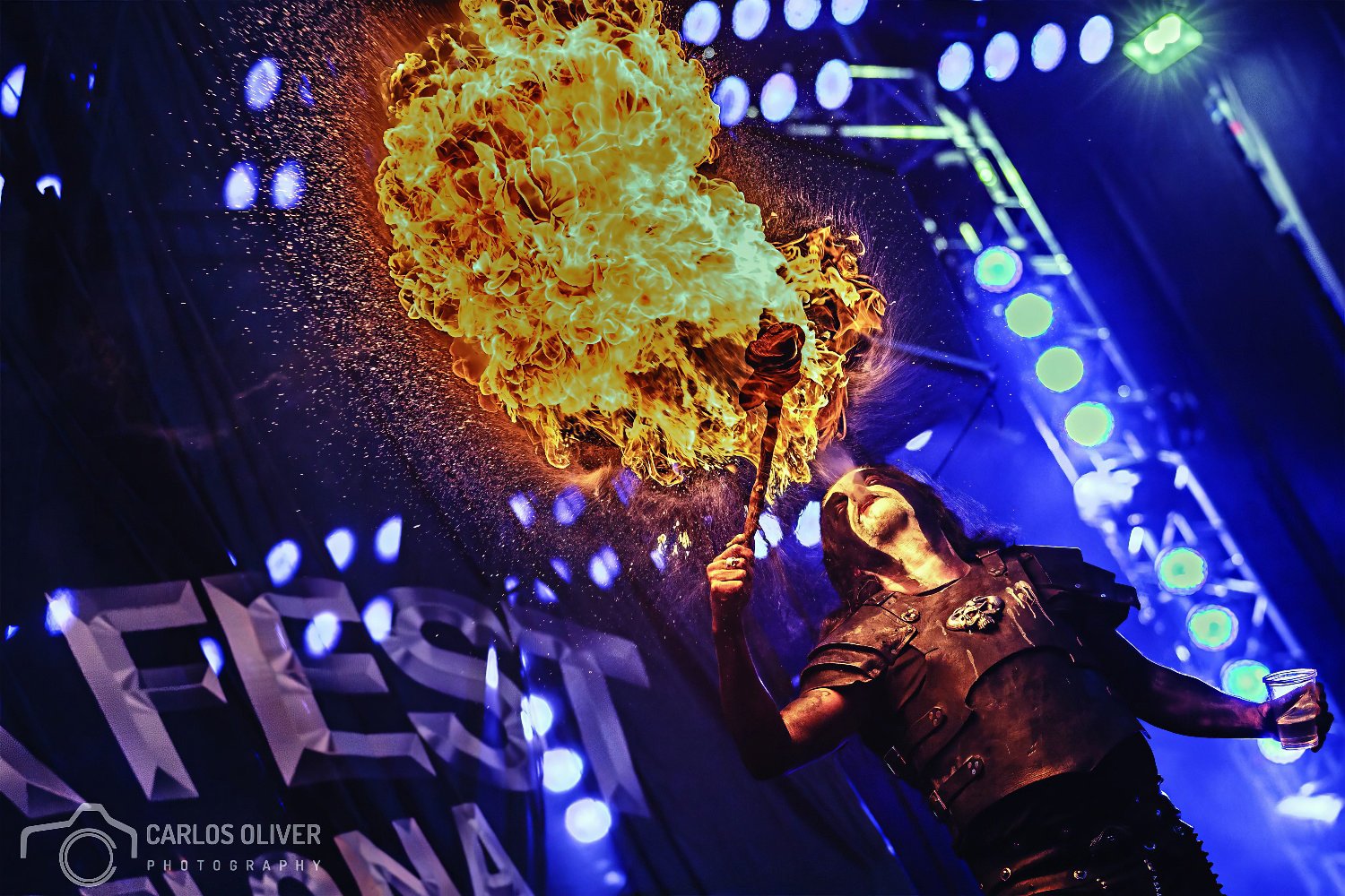 A la hora de tomar fotos me considero un francotirador nato. Quizás sea por la herencia de mis inicios todavía con la fotografía analógica. Nunca hago fotos de manera indiscriminada, intento predecir situaciones y afinar en el momento justo. Siempre hay que estar alerta y preparado para captar el momento, porque a veces la foto ideal se da cuando menos te lo esperas. En este caso, no había empezado todavía la actuación, pero cuando vi que Abbath salía desde la esquina del escenario con la antorcha y la botella sabía lo que tres segundos después iba a suceder. El tiempo preciso para ajustar, enfocar y disparar.