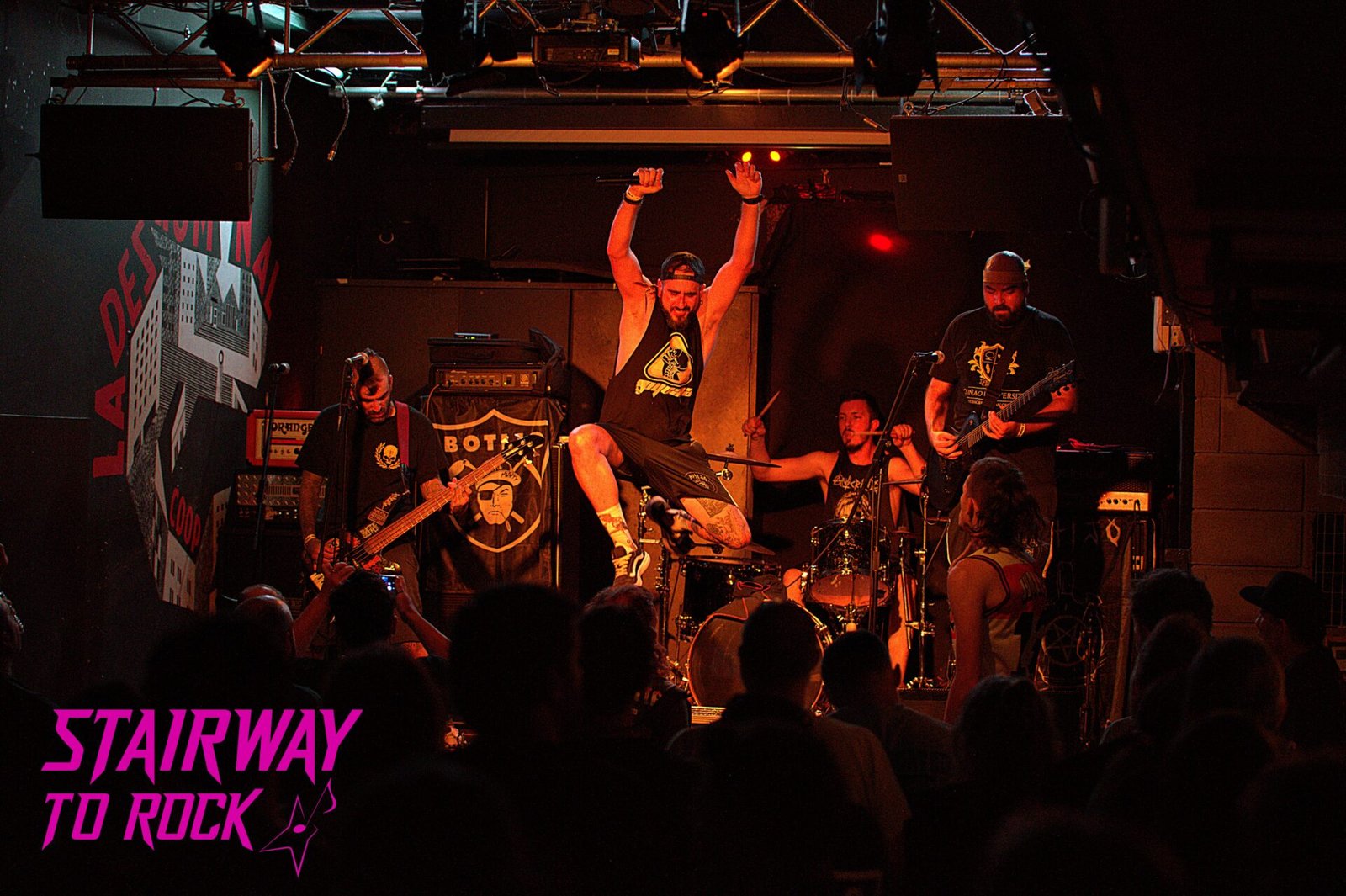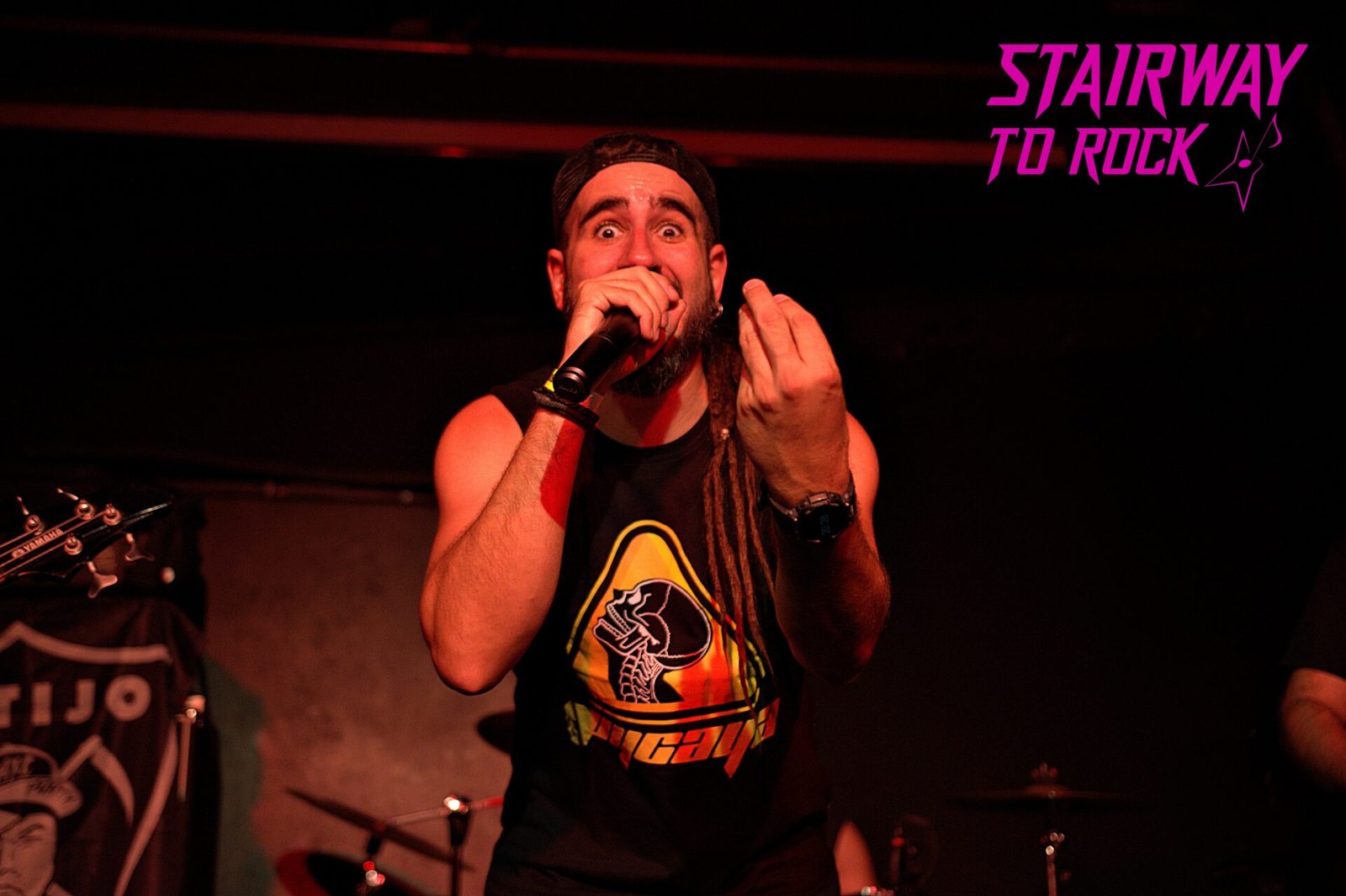 Tras un cambio de equipo que se prolongó algo más de lo previsto, los siguientes en ocupar el pequeño escenario de la Deskomunal fueron Botijo. Y con ellos llegaron las guitarras afiladas, propias del thrash/death, la diversión y el despiporre. Con un botijo colocado en el filo del escenario, -para el que quisiera pudiera aplacar la sed-, la banda salió con el cuchillo entre los dientes dando buena cuenta de temas de candente actualidad con zarpazos arrolladores como “#Damelikemierda”. El público no tardó mucho en sumarse a la fiesta, y más aún cuando durante “¿Donde Está Wally?”, parecieron en la sala un par de chavales luciendo la habitual indumentaria del popular personaje mientras bailaban entre la gente.