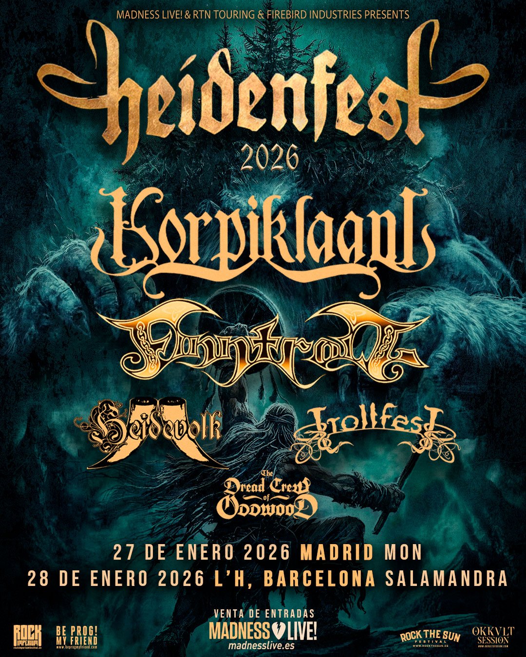 La noche de L’Hospitalet se transformó, ante mis ojos, en un claro del bosque finlandés bajo el influjo del Heidenfest, una de las giras más esperadas del año, que traía de regreso a los auténticos maestros del desenfreno folk: Korpiklaani. La expectación era máxima, no solo por la envergadura del festival —con un cartel compartido con gigantes como Finntroll y Heidevolk—, sino por la oportunidad de presenciar en directo la madurez de una banda que ha sabido evolucionar sin perder ni un ápice de su esencia rústica y festiva.