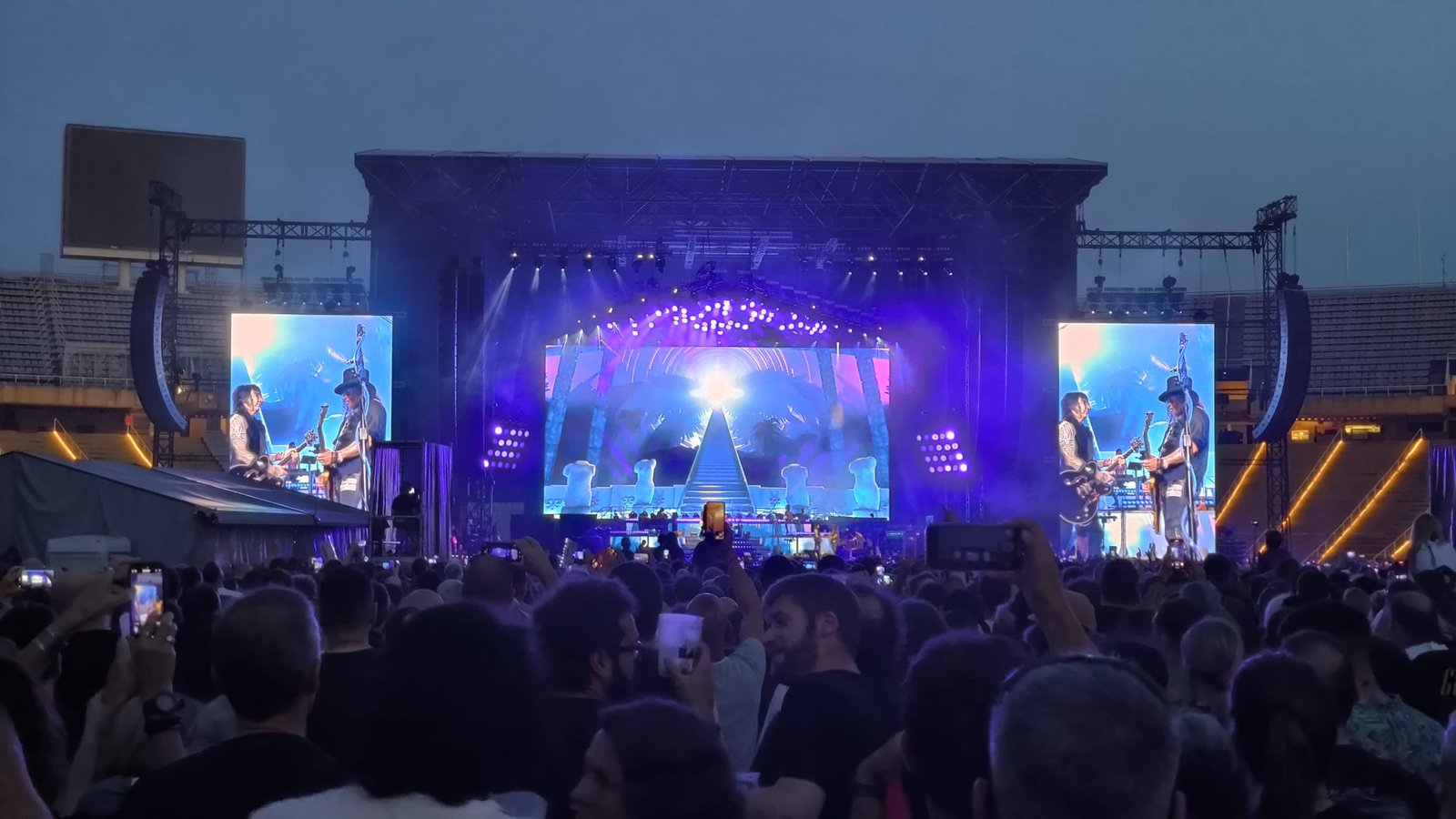 A partir del “Live and Let Die” de los Wings la cosa mejoró, pero ese gran momento que es este tema en directo tampoco nos hizo despegar. “Double Talking Jive” fue absolutamente guitarrera con Slash de absoluto protagonista, pero luego llegó el turno de “You Could Be Mine” y la gente se volvió loca. Había referencias a Terminator en las pantallas, con esa mano de cyborg para luego hacer cantar a toda la parroquia Gunner con la versión de Dylan: “Knocking on Heaven’s Door” Los tonos azulados y la corista ayudaron en uno de los grandes momentos del directo.