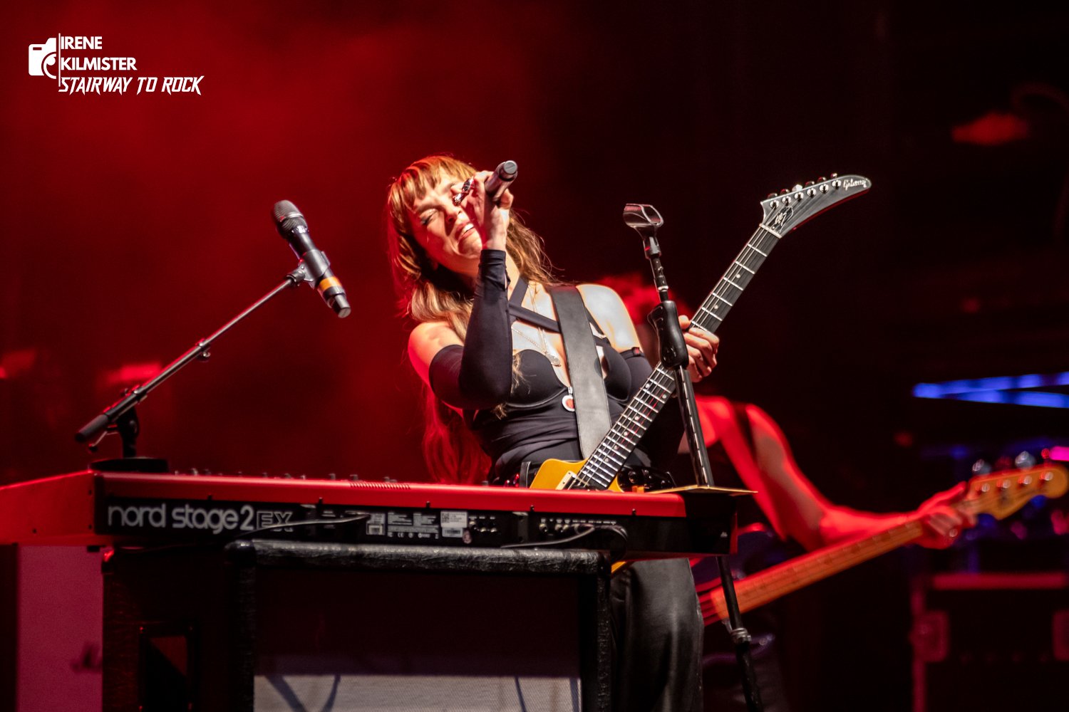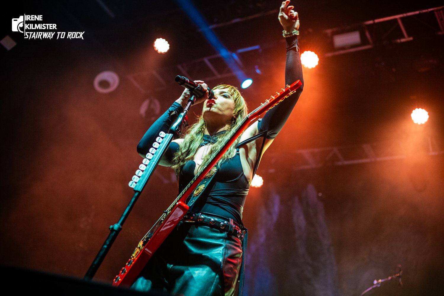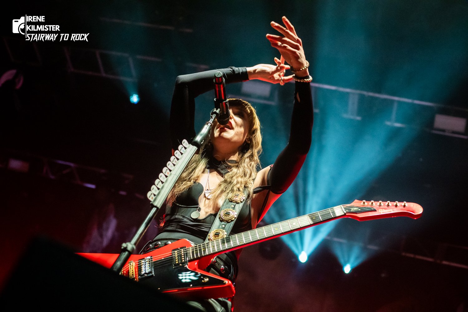 “Esto es una celebración…”, fueron las bonitas palabras antes de encarar “Darkness Always Wins”, bajo unas preciosas luces azules y con un crescendo estremecedor. Fue uno de los grandes momentos de la noche, y es que es un temazo absoluto… Le sacaron el piano a la frontwoman definitiva y empezó otra charla con bastante carga de autoayuda. Es algo que no me gusta especialmente, pero es todo positividad, como lo fue la intensa “Shiver”. “Barcelona… ¿queréis volar?”, así se nos presentó la tremenda “I Am the Fire”, en la que vimos a Lzzy y Joe Hottinger con guitarras de doble mástil.