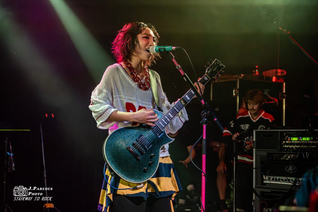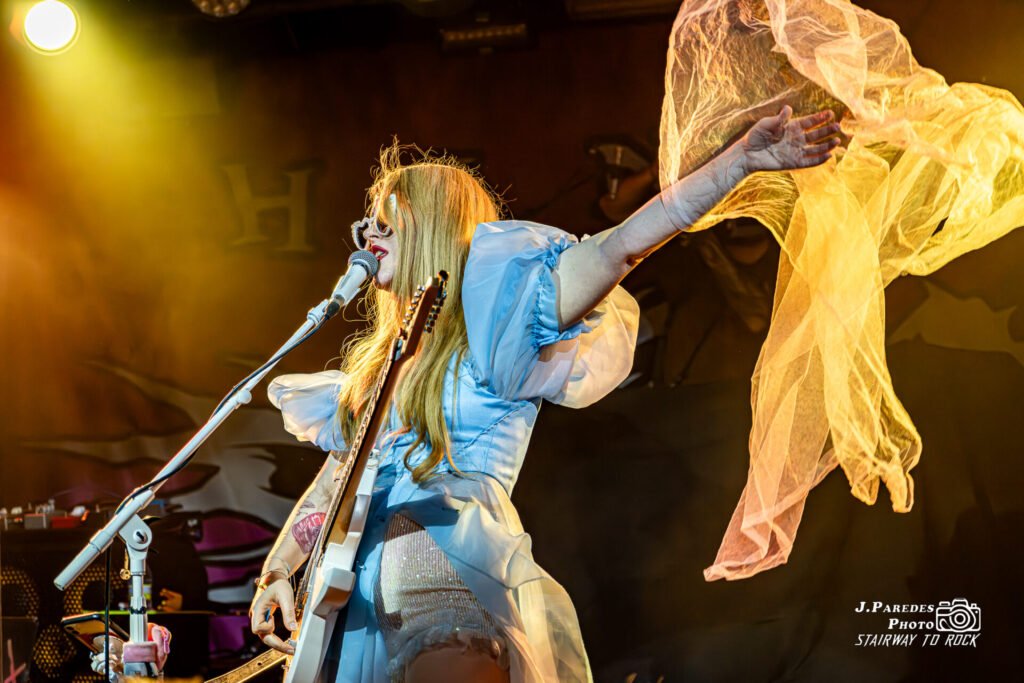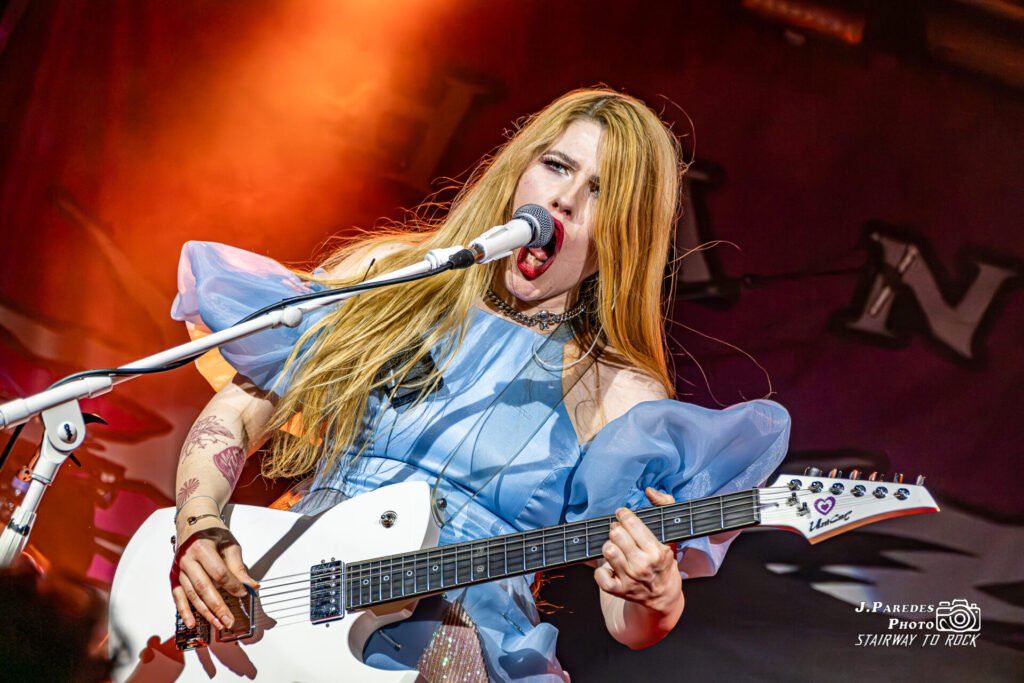 Vestida de blanco y azul celeste, con un aire que parecía sacado directamente de un cuento clásico, un vestido que hacía pensar inevitablemente en Cenicienta. Solo que esta parecía haber escapado de su propio baile para aterrizar sudando y gritando en mitad de un escenario. La cantante irrumpió con la guitarra colgada como si fuera un arma recién empuñada. Ese contraste entre cuento de hadas y agresividad metálica marcó el tono de todo su show: delicadeza vocal enfrentada a rugidos guturales, melodías pop hechas trizas y una presencia física que oscilaba entre lo angelical y lobo feroz.