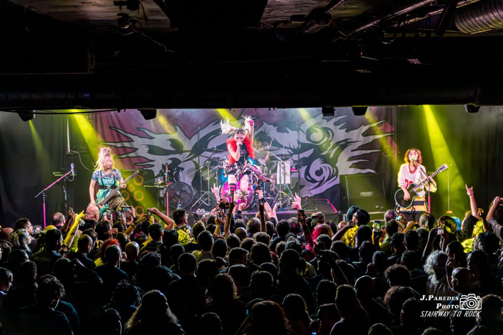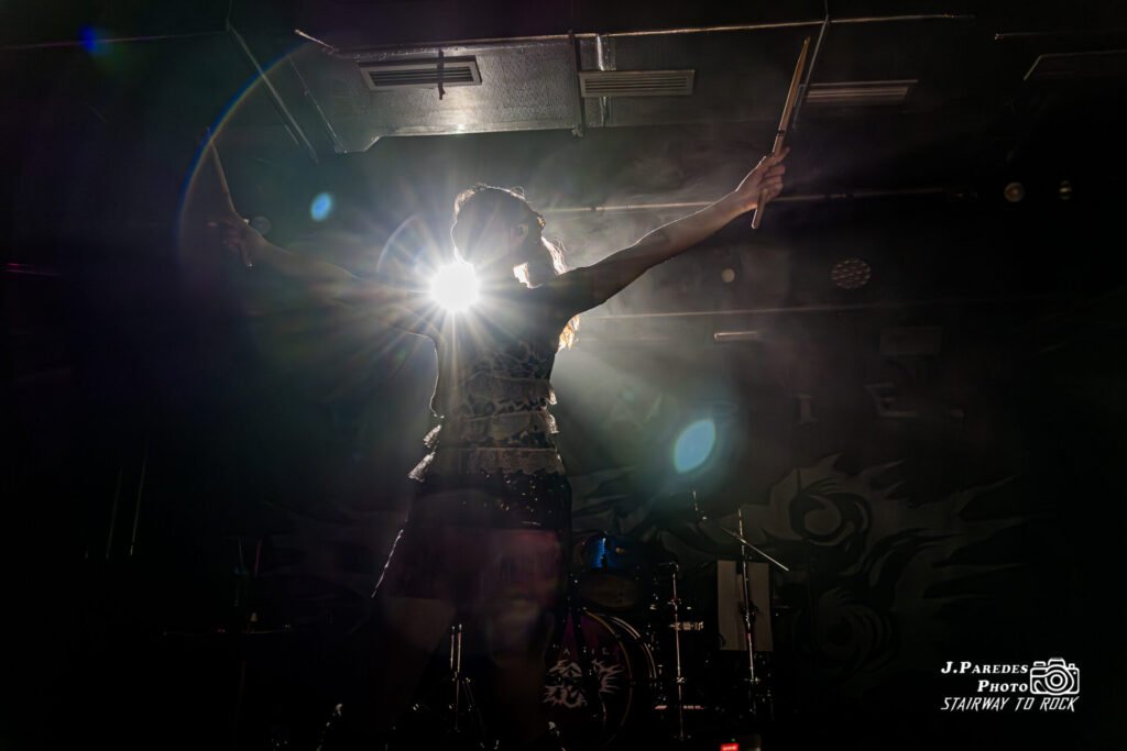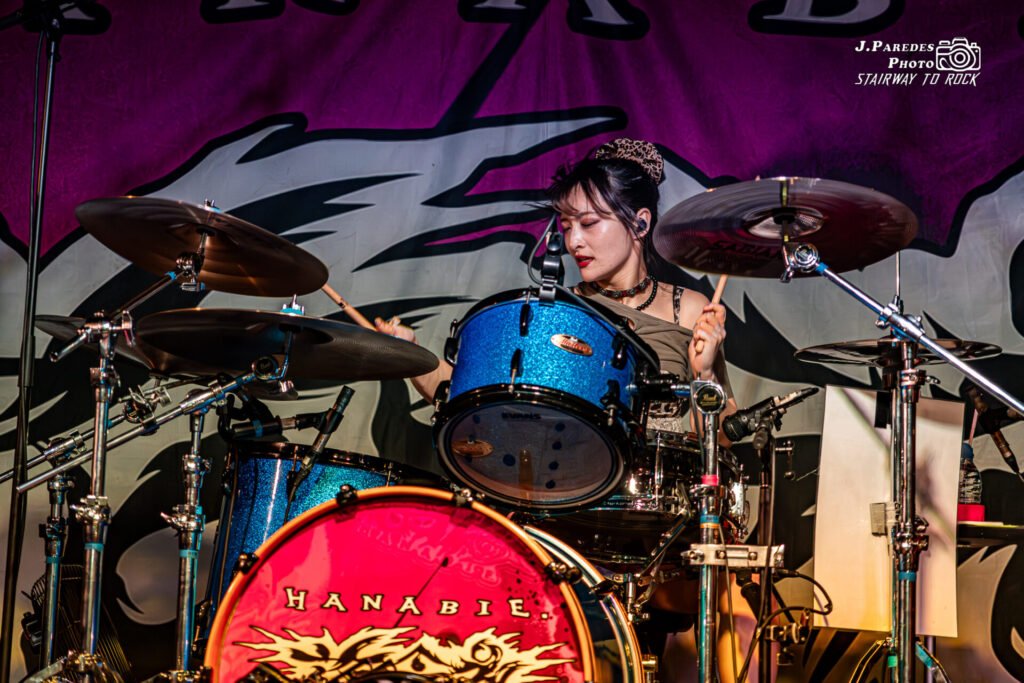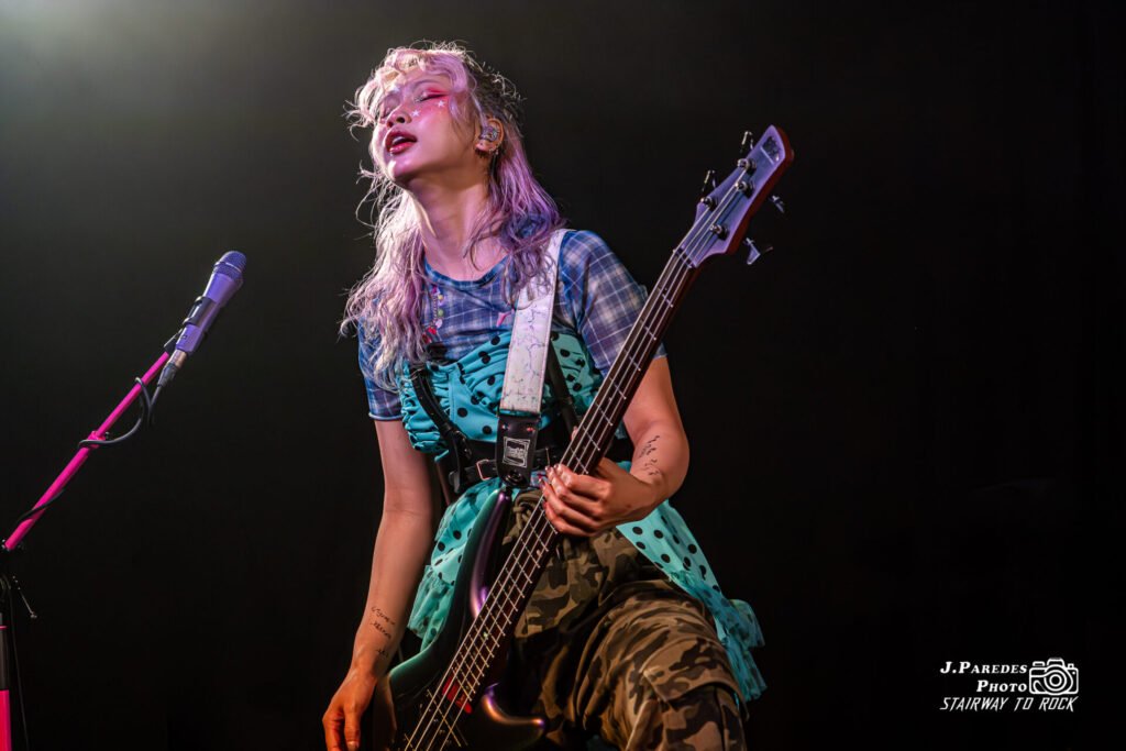 Tras un breve cambio sobre el escenario, el ambiente se transformó. El público, que ya había entrado en calor, terminó de mutar cuando las luces se apagaron y un foco de contraluz dibujó la primera silueta sobre las tablas: Chika, levantando las baquetas como quien invoca un hechizo. Después entró Hettsu, saludando tímida pero firme antes de agarrar el bajo. Luego apareció Matsuri, la guitarrista, con su aura de ídolo del anime metalizado. Por último, entre gritos del público y una ola de móviles en alto, emergió Yukina.