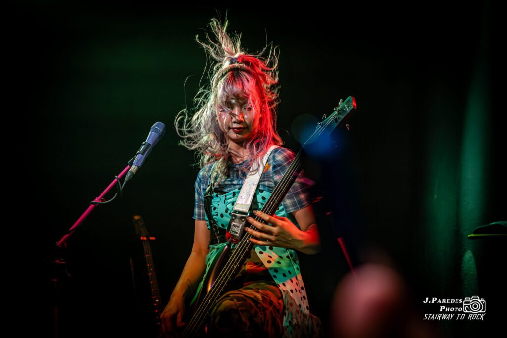 Yukina era una tormenta eléctrica. Saltaba, corría, giraba y hacía headbanging con una energía que parecía inagotable. A veces parecía más ligera que el aire, como si realmente estuviera a punto de despegar del escenario. Chika golpeaba la batería con intensidad quirúrgica; Hettsu marcaba el ritmo con una sonrisa juguetona; Matsuri combinaba riffs afilados con movimientos tan expresivos que recordaban a las poses de presentación de personajes de videojuego.