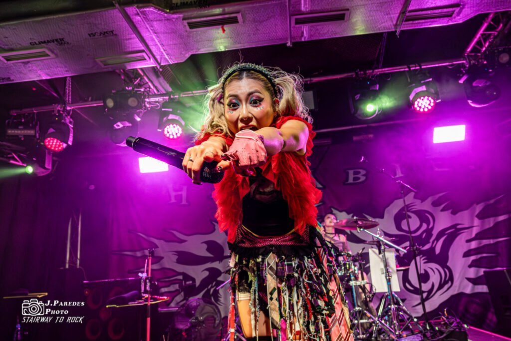 Desde las primeras estrofas, Yukina alternó guturales profundos que parecían salir de otra persona con liricos y voz cute estilo opening de anime donde en muchas de ellas también participaba Matsuri. El contraste era tan extremo como magnético. El público respondió instantáneamente con pogos que empezaron suaves y acabaron arrastrando a la sala entera en una espiral de energía colectiva.