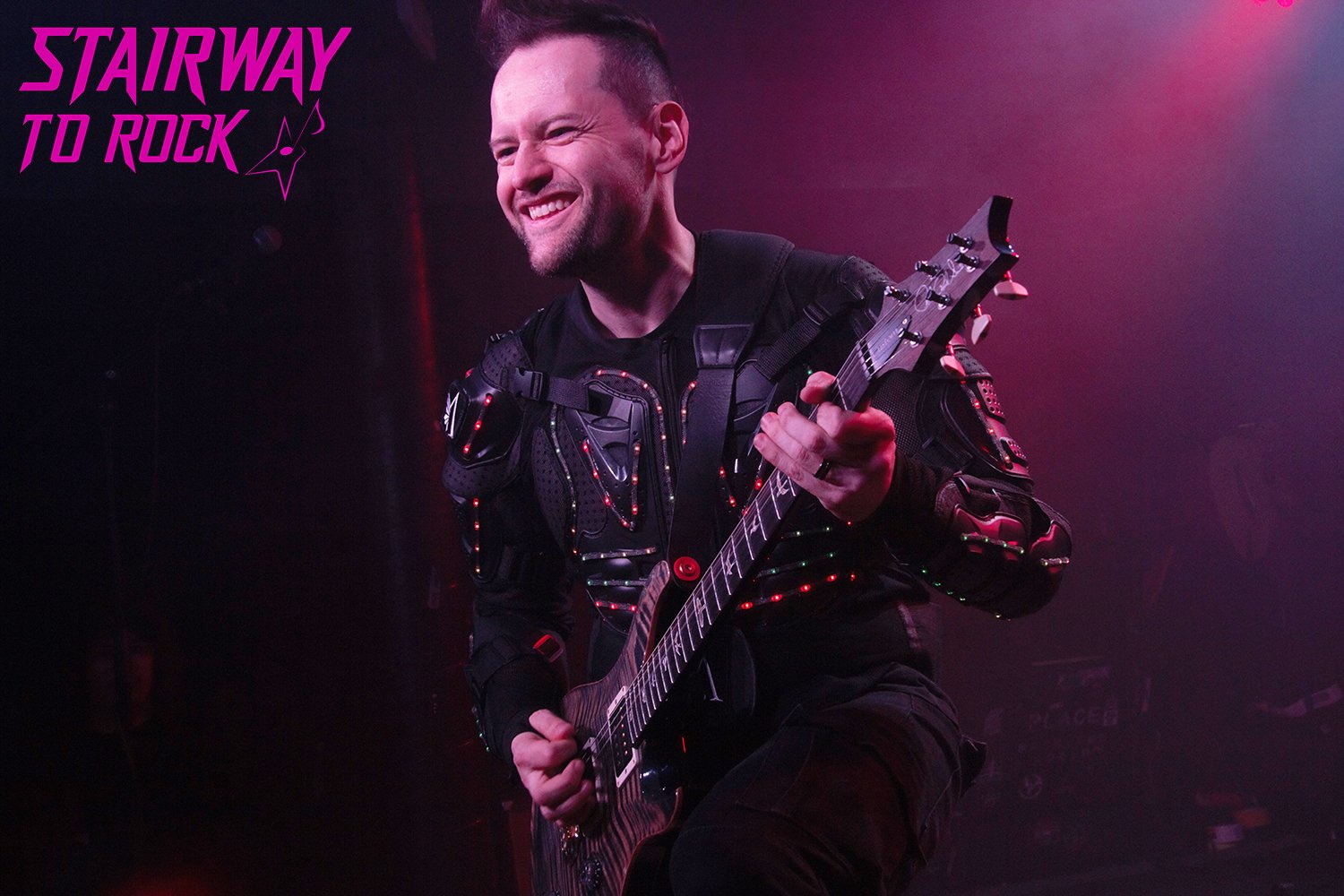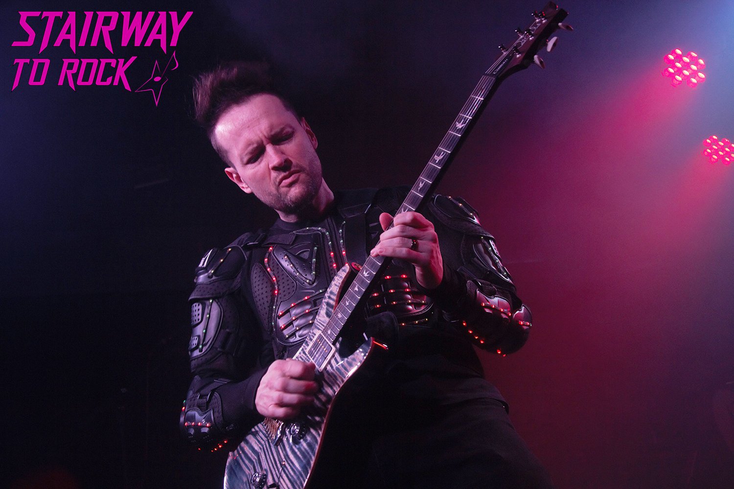 Ya nada más llegar frente al escenario todo se transformó en un campo de batalla lumínico para recibir a Andy Adams, el guitarrista colombiano que encarna la perseverancia rockera. No fue solo un concierto, sino un espectáculo futurista: Adams emergió enfundado en una deslumbrante armadura LED controlada a distancia, una metáfora visual de su renacimiento personal tras la adversidad. Desde el inicio, Adams estableció una conexión íntima al dirigirse al público exclusivamente en español, compartiendo su poderosa historia de lucha y triunfo. El público, además de cautivado por la espectacularidad visual, quedó gratamente sorprendido por la técnica depurada de Adams y por su palpable simpatía, que humaniza la máquina futurista.