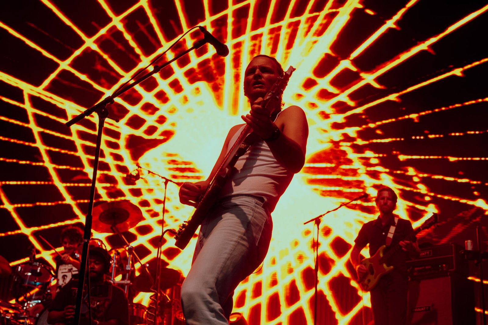 En “Daily Blues” Ambrose toma las riendas vocales en un tema que se acerca especialmente a los terrenos de The Doors, tirando en muchos momentos de jam pura y dura con formas geométricas gigantes apareciendo en la pantalla trasera. El grupo estuvo muy dinámico, y pese al peso musical evidente, también tuvieron momentos de comunicación en los que presentaban a los miembros del grupo antes de atacar “Le Risque” y “The Garden Goblin”, en un tramo de concierto en la que las sonoridades blues campaban por sus anchas, demostrando que el arco del Rey Gizzard tiene multitud de cuerdas. Tiraron de luces rojas y el baterista Michael empezó a berrear como un poseso en tramos de la canción.