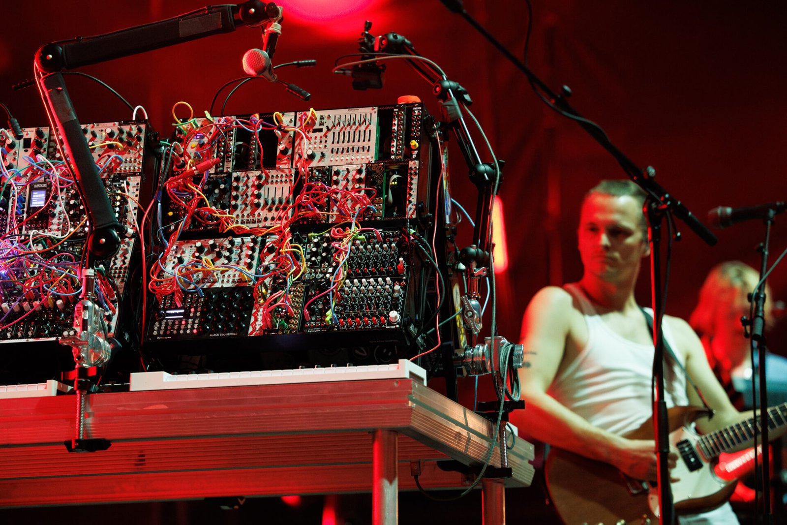 Ambrose y Joey van turnándose a las voces más allá de Stu a la vez que entramos en mundos como el de “Supreme Ascendancy”, ya con bases pregrabadas y sitares de fondo. Y de golpe y porrazo pasamos a “Antartica”, con sonidos soul, de lo más festivo, aunque con esa pátina de sonido y marca que llevan impresa, ese fuzz constante y esas voces con toques distorsionados. Hubo de fondo icebergs para dar ambientación a la canción. Luego la oscuridad de “The Reticent Ranconteur” para desembocar en la maravillosa “The Lord of Lightning”… Luces azuladas, relámpagos ambientando de fondo y sus habituales juegos de incluir fragmentos de otros temas de su fondo de catálogo para el deleite de los fans más die-hard.