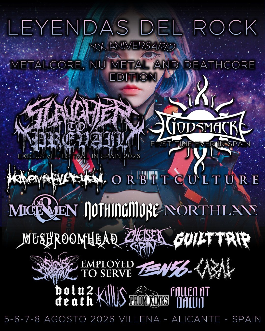 El XX Aniversario de Leyendas del Rock demuestra que el presente y el futuro del metal también tienen su trono. Metalcore, Nu Metal y Deathcore se dan la mano en una edición donde la variedad manda y el volumen no entiende de límites. Por primera vez, el festival recibe a auténticos pesos pesados del metal moderno como STP, Godsmack y Of Mice and Men, acompañados de muchas más bandas que representan la cara más actual y contundente del género. Una selección pensada para saltar, sudar y acabar afónico antes del segundo tema. Aviso: no apto para cuellos sensibles.