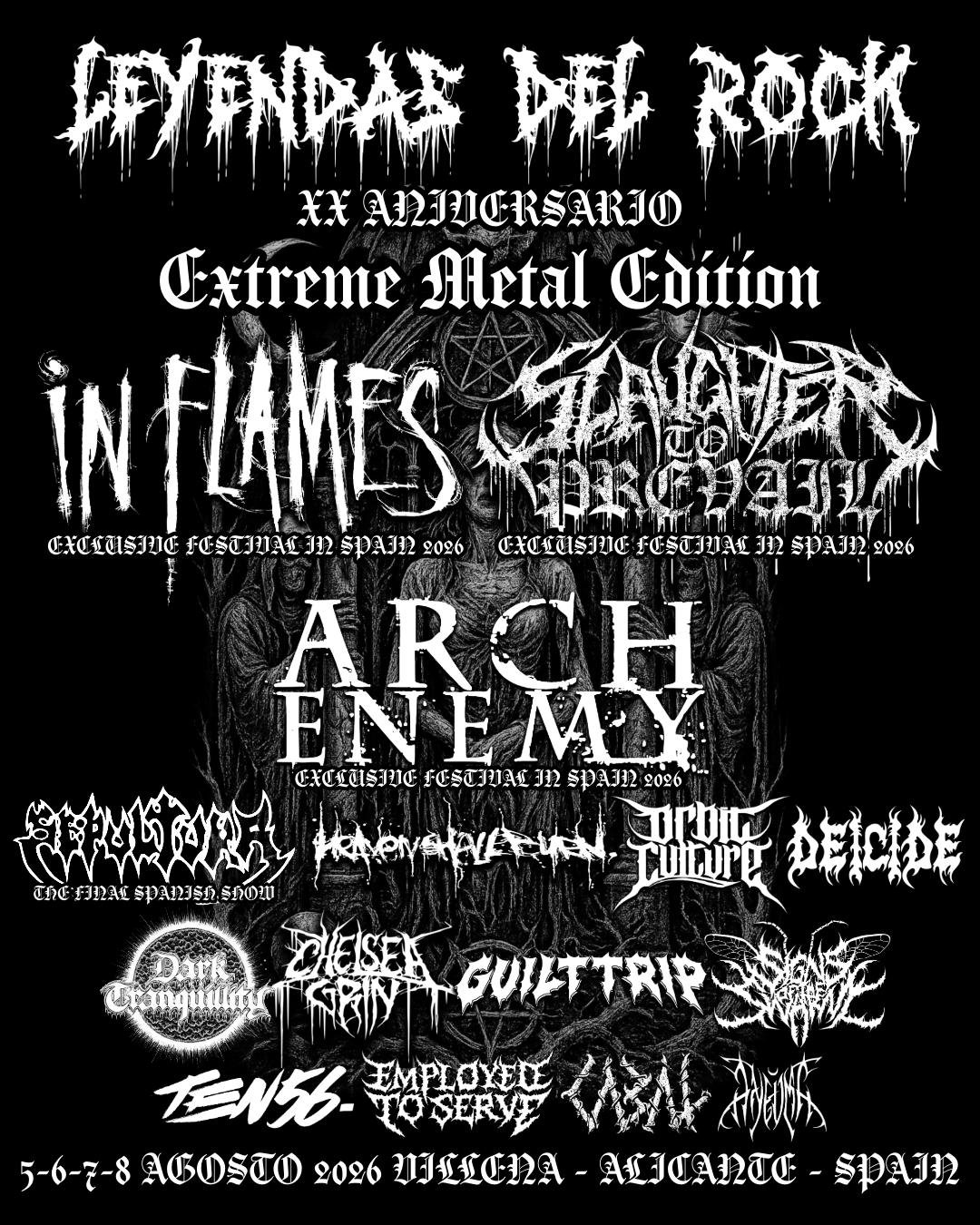 El lado más salvaje del festival también tiene su espacio bien ganado en el XX Aniversario. Leyendas del Rock 2026 desata la tormenta con referentes del Death Metal Melódico como In Flames, Arch Enemy y Dark Tranquillity, auténticos titanes del Deathcore como STP o Chelsea Grin, y leyendas absolutas del metal extremo como Sepultura y Deicide. Una alineación diseñada para quienes buscan riffs afilados, doble bombo sin piedad y una experiencia tan intensa como inolvidable. Aquí no se viene a escuchar… se viene a sobrevivir.