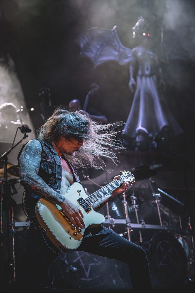 Entonces fue cuando tuvo lugar la espectacular aparición de Rafa, embutido en su gabardina negra a lo neo, apareciendo en mitad del escenario desde una plataforma elevadora, seguida del resto de la banda en medio de un estallido de fuego…  ¡Inmejorable! “Alicia en el Metalverso” fue bien recibida, aupada también por el entusiasmo que genera siempre la primera canción de cualquier concierto. Sin embargo, pronto se evidenció que algo fallaba: las voces iban y venían, guitarras desdibujadas y una reverberación incómoda que flotaba en el ambiente como una presencia no invitada…en general, la famosa “bola de sonido”. Como estos problemas fueron una constante en gran parte de la actuación y ya lo hemos explicado al principio, no usaremos más espacio de esta crónica para mencionarlos. Destacaremos también la aparición de Diva Satanica, con sus espectaculares guturales.