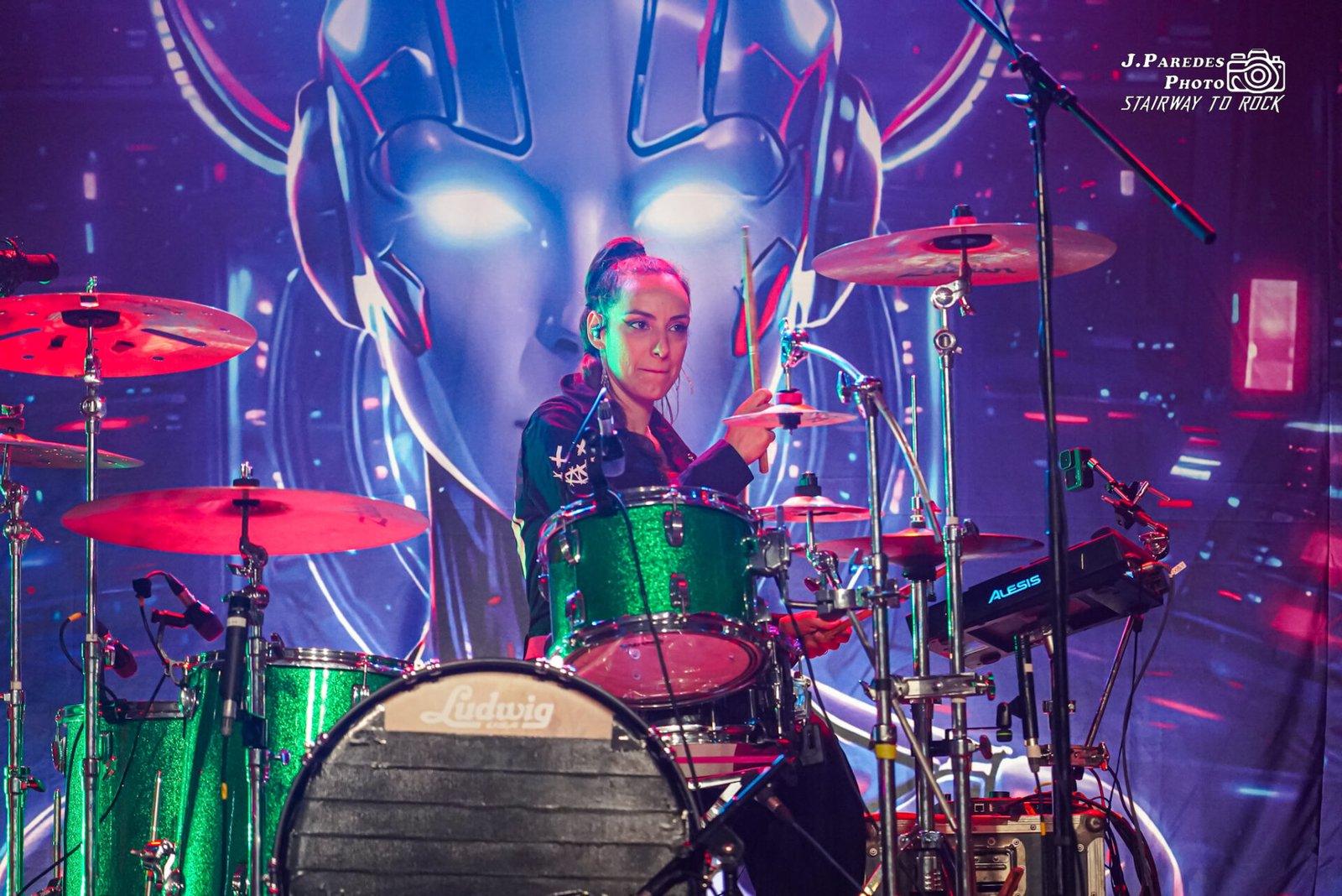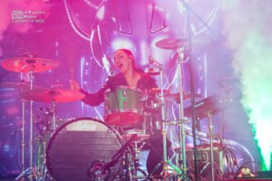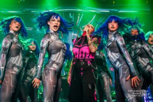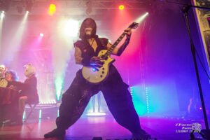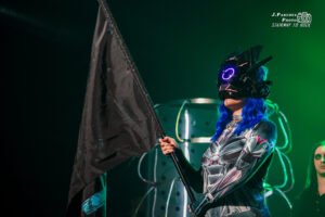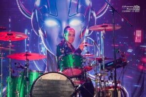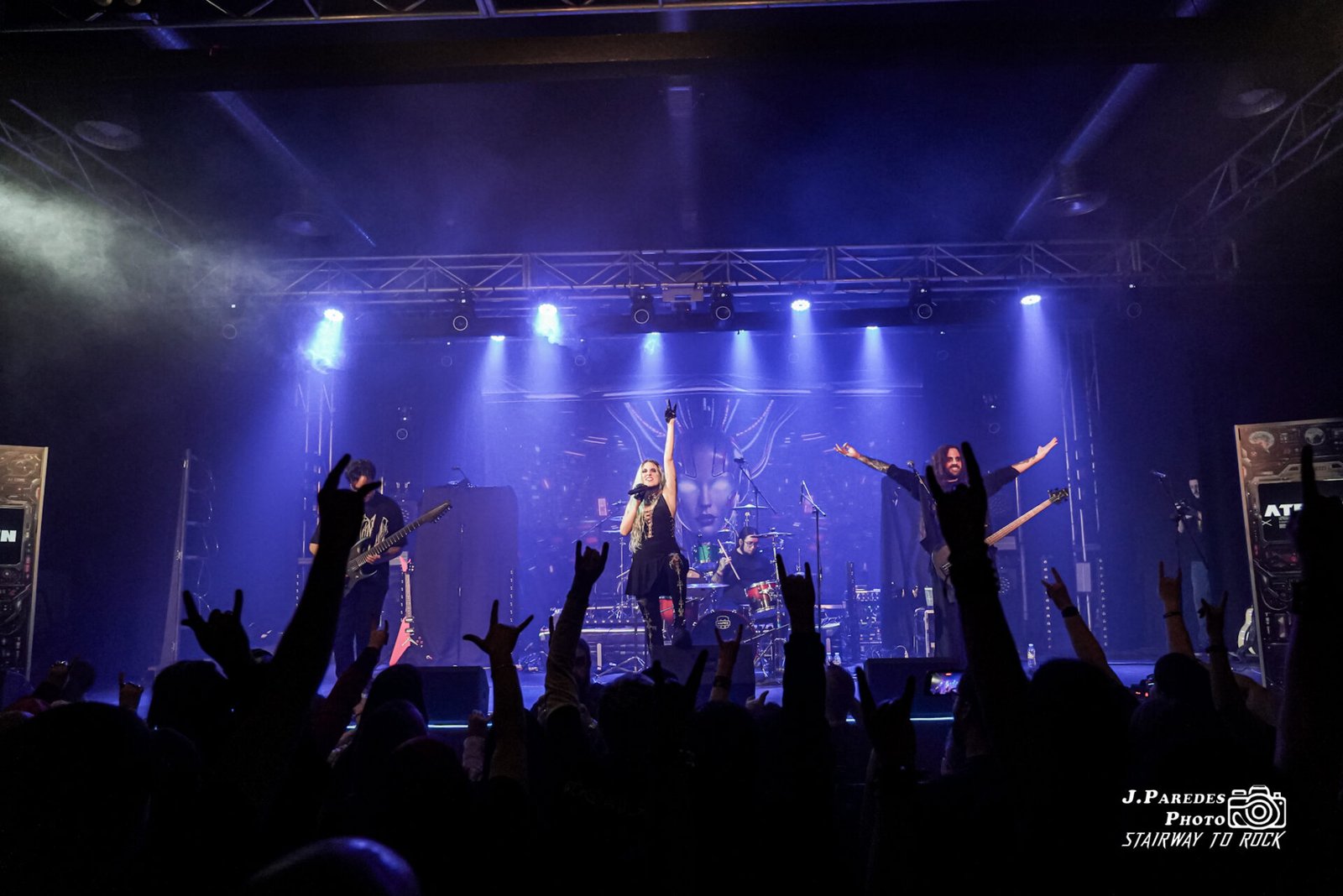 El espectáculo que nos brindó Megara para una banda de sus dimensiones, que por mucho pasado eurovisivo que tengan no son tan grandes como algunos piensan, sólo puede tildarse de brutal. La banda había planteado este concierto como un renacer, de ahí el título del álbum que estaban presentando, a raíz de las dificultades que atravesaron hace un año. Nos ofreció Megara una representación conceptual, con pantallas a ambos lados del escenario, en las que antes de que tocaran las canciones del nuevo disco una malvada inteligencia artificial de nombre A.U.R.A. nos dejaba claro que pretendía sabotear este concierto. Más allá de que estos vídeos sirvieran para que el grupo se tomara un respiro de vez en cuando, preparaban una genialidad que ninguno de los asistentes vimos venir y de la que hablaremos en breve.