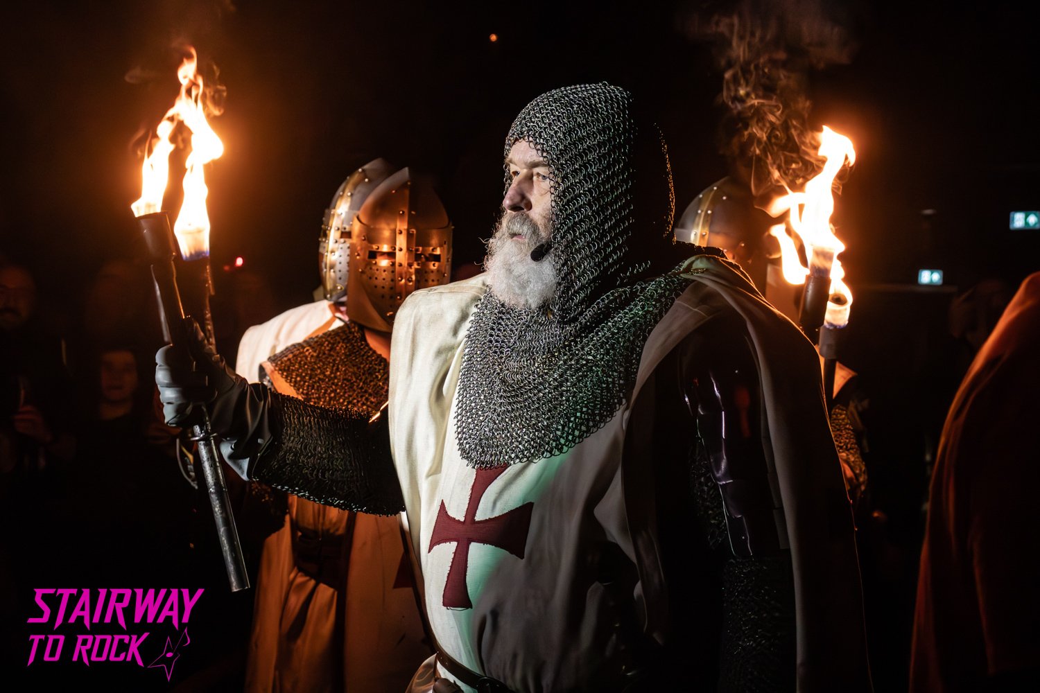 Ya me habían avisado de que el concierto iba a ser largo y… así fue. Había dos escenarios, uno de ellos pequeño al otro lado del gran pabellón y del que emergió un Napoleón rodeado de antorchas. Obviamente este señor de la guerra no tiene muchos fans en Inglaterra. Divertido, se extendió en su palabrería hasta que se le sumó Kublai Khan y luego César, que terminaría apuñalado por la espalda por los dos anteriores. Y luego… aparece por un lado de la sala Jacques de Molay con los temparios. Los roadies iban de monjes y ves que no paran de un lado a otro.