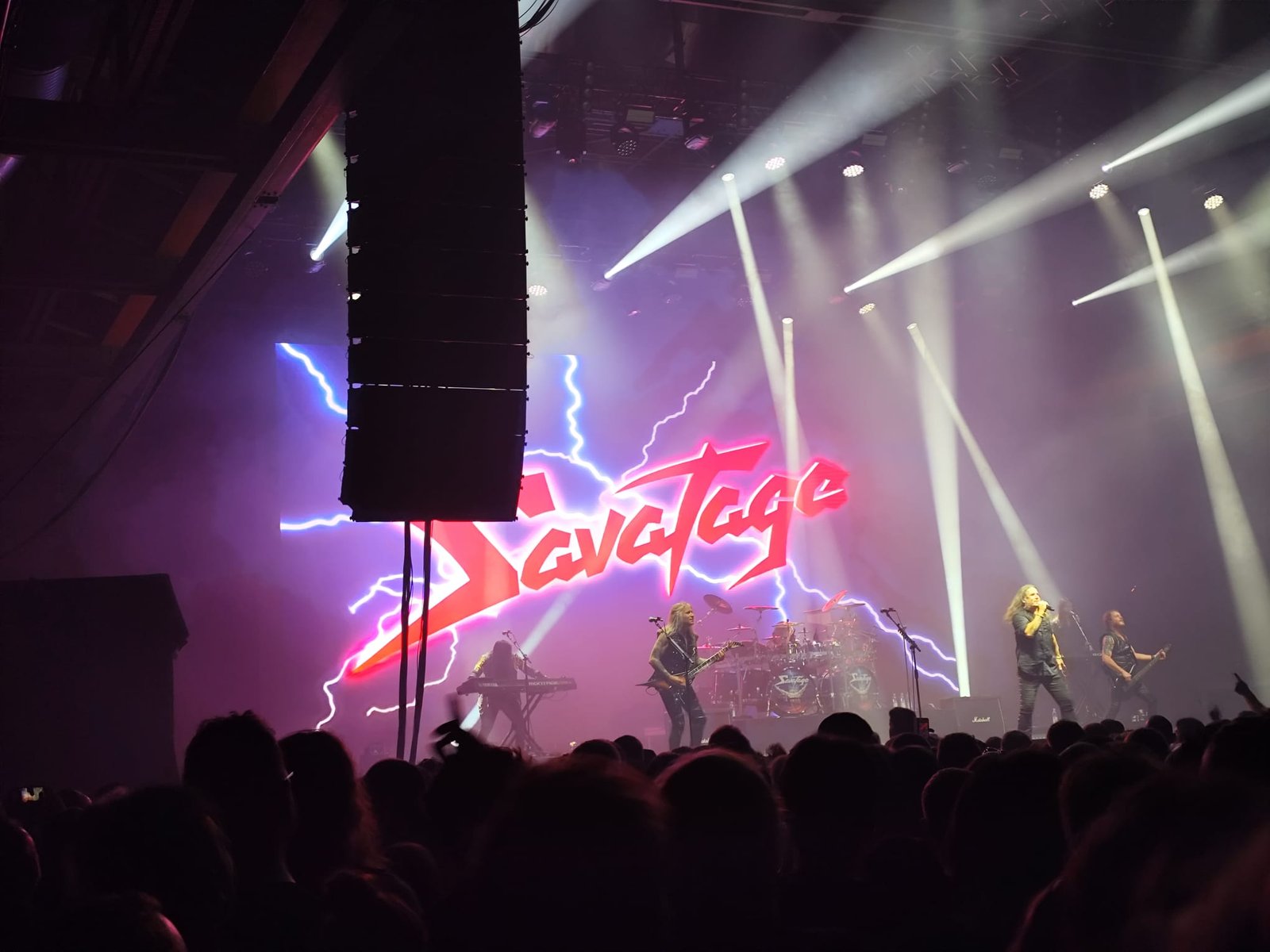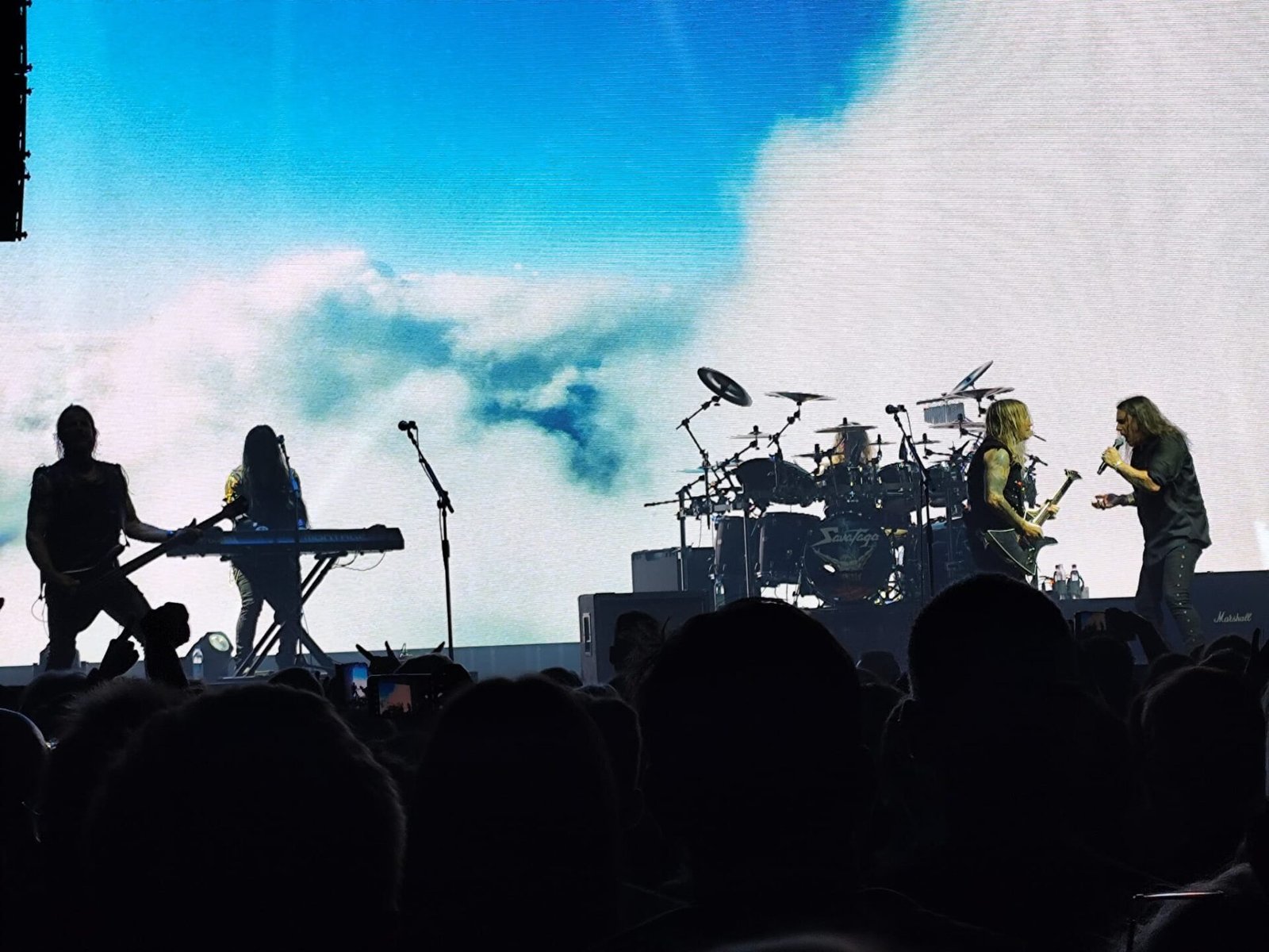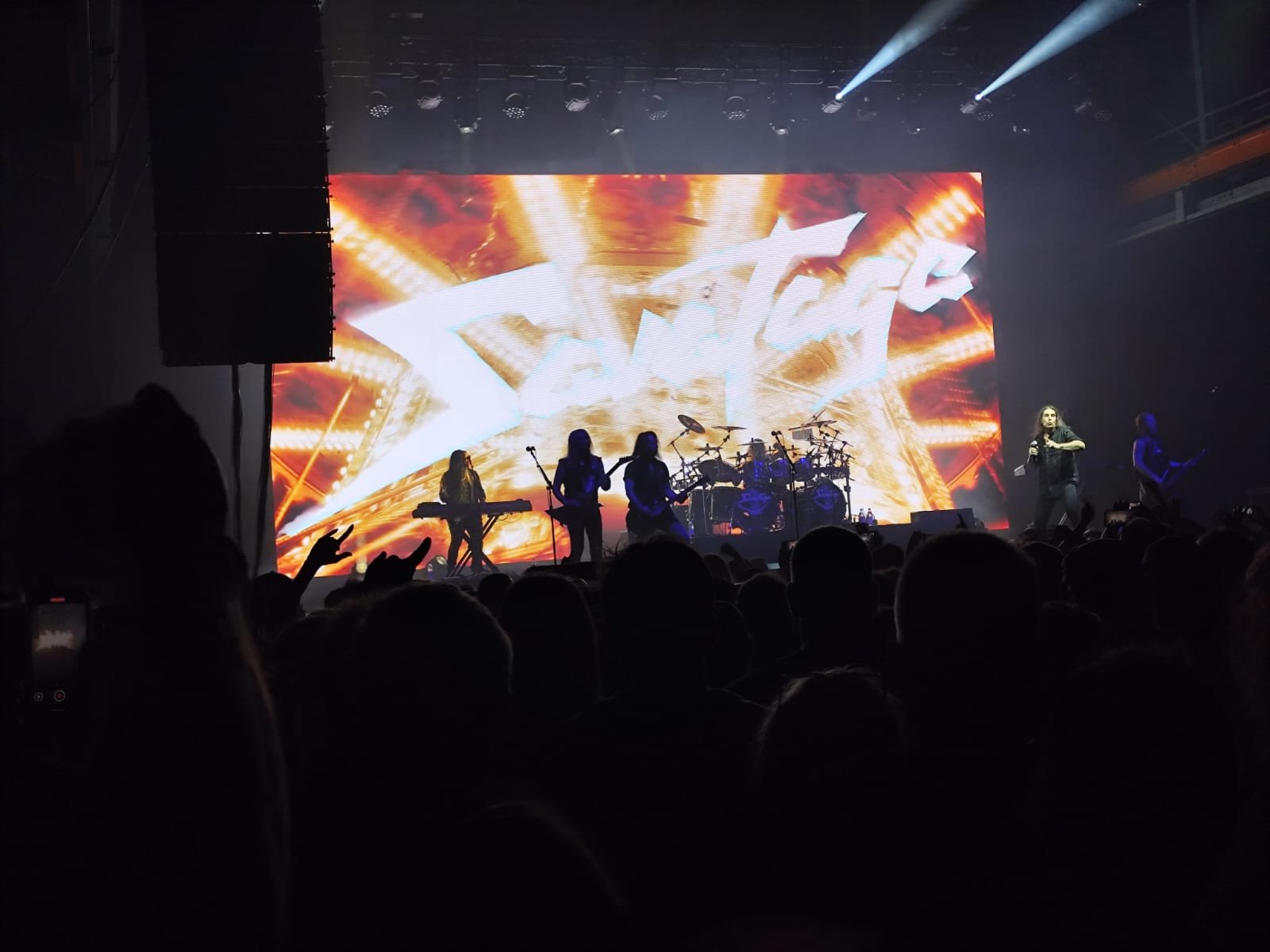 Y Savatage salieron puntuales, a las 20:59, con una formación de siete miembros, batería, dos teclistas (uno a cada lado del escenario) y, al frente, Johnny Lee Middleton, Chris Caffery, Zak Stevens y un guitarrista cuyo nombre se me escapa ahora. Arrancaron con fuerza, sin concesiones, y un espectáculo visual que no decayó en casi ningún momento. Una pantalla gigante al fondo proyectaba visuales que reforzaban la atmósfera del show, salvo en contadas ocasiones.