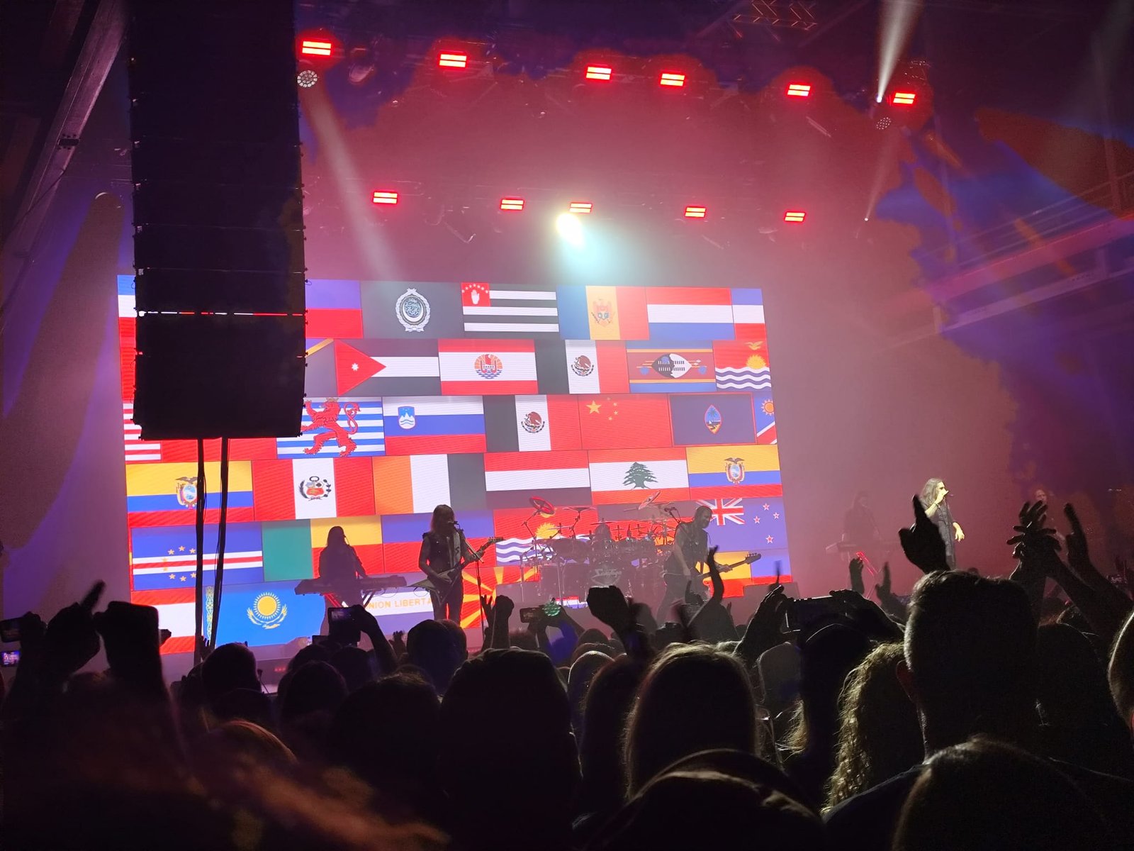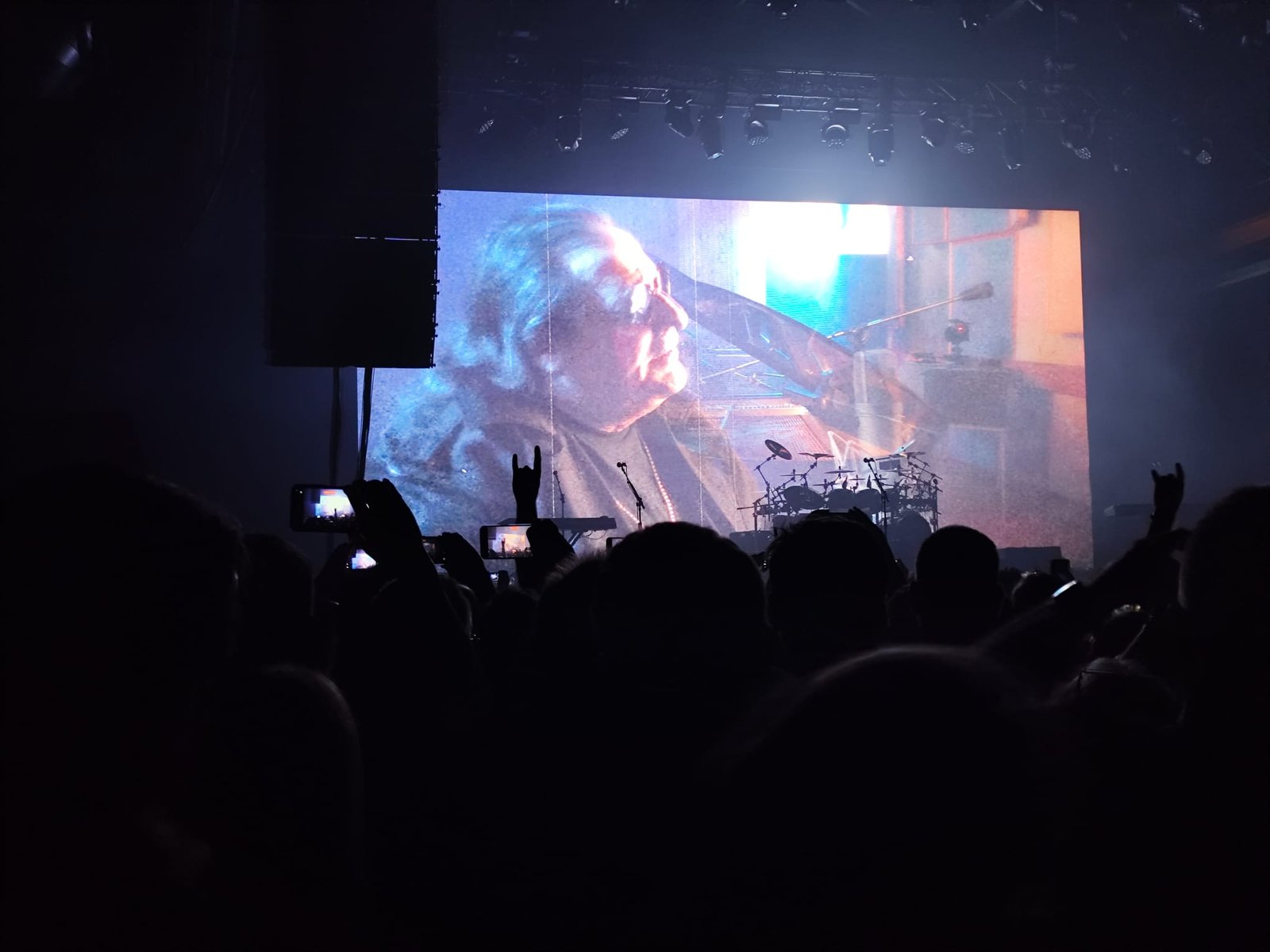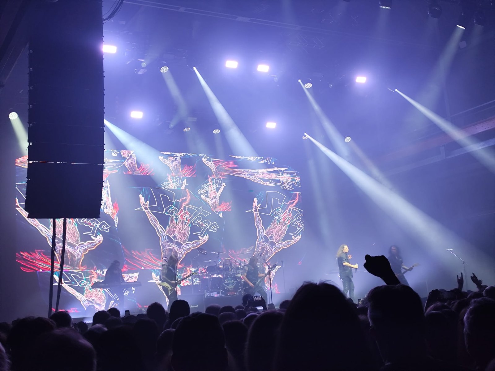Y Savatage salieron puntuales, a las 20:59, con una formación de siete miembros, batería, dos teclistas (uno a cada lado del escenario) y, al frente, Johnny Lee Middleton, Chris Caffery, Zak Stevens y un guitarrista cuyo nombre se me escapa ahora. Arrancaron con fuerza, sin concesiones, y un espectáculo visual que no decayó en casi ningún momento. Una pantalla gigante al fondo proyectaba visuales que reforzaban la atmósfera del show, salvo en contadas ocasiones.