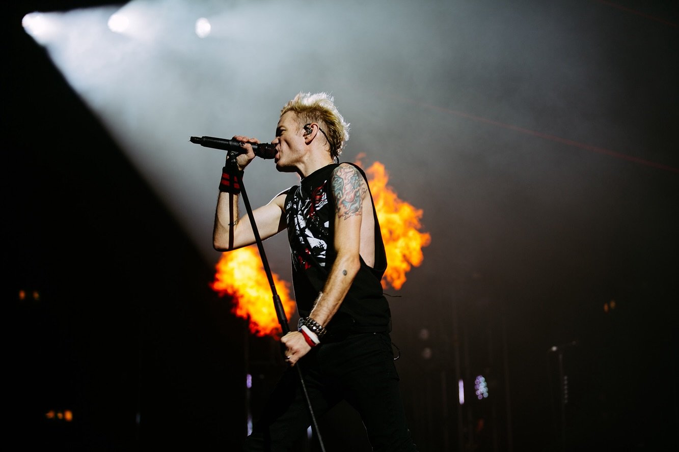 A las 21h en punto salieron con “T.N.T” de AC/DC de fondo y con aires de banda que está preparada para pabellones y estadios. Apabullaron con “Motivation” del mítico All Killer, No Filler (2001) y subieron el listón con “The Hell Song”, tema que abre el que posiblemente sea su mejor LP: Does This Look Infected? Acompañando con pirotecnia y efectos de luces fueron desgranando temazos de la talla de “Over My Head (Better Off Dead)”, “No Reason”, “Out For Blood”, “War”, la simpática “Undersclass Hero” con unos globos que Deryck Whibley se dedicó a pinchar con su micro, la ecléctica “Noots” y las nuevas “Landmines” y “Dopamine”.