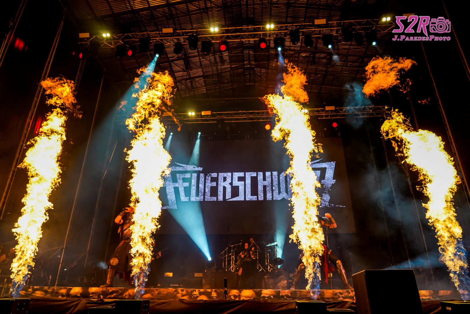 Chispas, humo y fuego acompañaron ‘Ultima noche” con un inspirado Hodi, que lucía cota de mallas e iba cambiando de instrumentos. El líder de D’Artagnan es un auténtico portento de voz y de carisma. “Schubsetanz” vino con coreografía de chicas con fuego, y es que hay hasta ocho personas sobre el escenario y se cuidan de que no paren de suceder cosas en el mismo. El público coreó el nombre de la banda y ellos elevaron sus martillos de guerra. “Berzerkermode” vino acompañada de fuego sin parar y en “Highlader” su líder nos preguntó: “¿queréis vivir para siempre?” para luego tirar de un solo de batería por parte de Rollo.