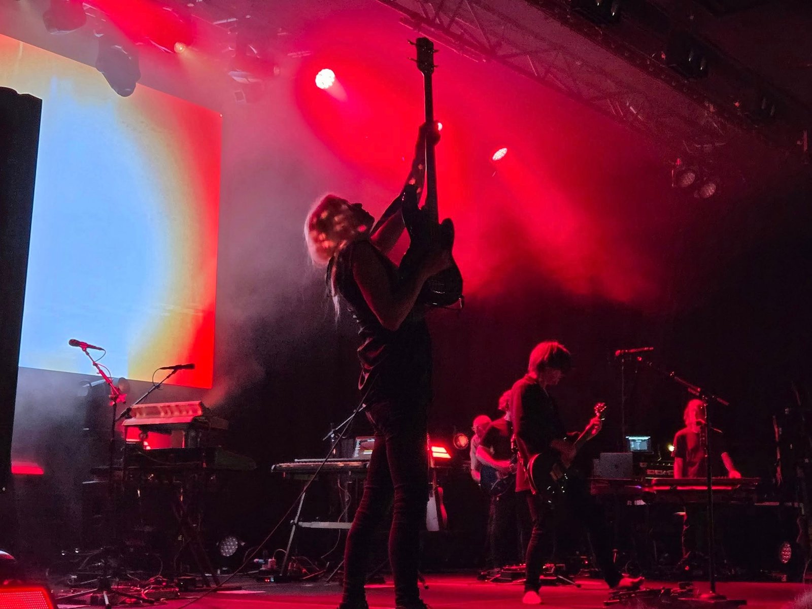 De sus mejores chistes fue el de “veréis que siempre estoy más en el lado izquierdo del escenario, porque en el derecho hay dos músicos de Estados Unidos, y me da la sensación de que si me acerco mucho me pondrán tasas y subirán aranceles”. Impresionó la cadencia de “Impossible Tightrope” con ese loop infinito y tanta musicalidad. Rizando el rizo, aparecieron unas gotas que caían con las notas tónicas de la música dando sensación de perfección. Luego dijo que quedaban dos canciones que eran cortitas: “Harmony Korine” fue bienvenida con vítores y aplausos siendo otro de los grandes momentazos de un gran concierto. Y “Vermillioncore”, con ese bajo inquietante culminó la segunda parte.