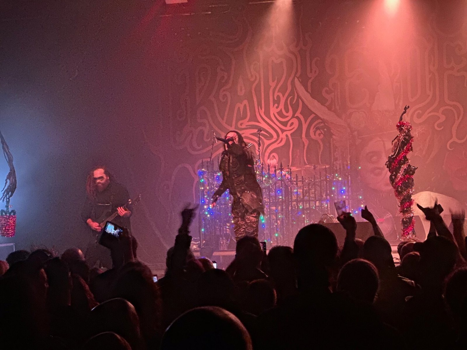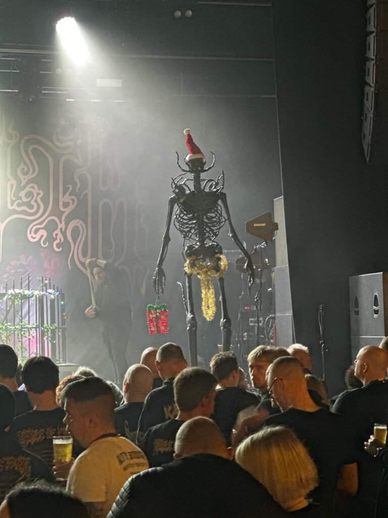 Tras la excelente actuación de Suffocation, el escenario empieza a preparase para el plato fuerte del menú. Los esqueletos y demonios habituales de la escenografía de Cradle Of Filth esta vez aparecen acompañados de una decoración propia de las fiestas decembrinas: gorritos de Papá Noel, bolsas de compras rojas y bastones de caramelo, a juego con las luces navideñas que adornaban la batería y gran parte de la tarima. Una decoración bastante original, que le dio un toque aún más festivo al show.